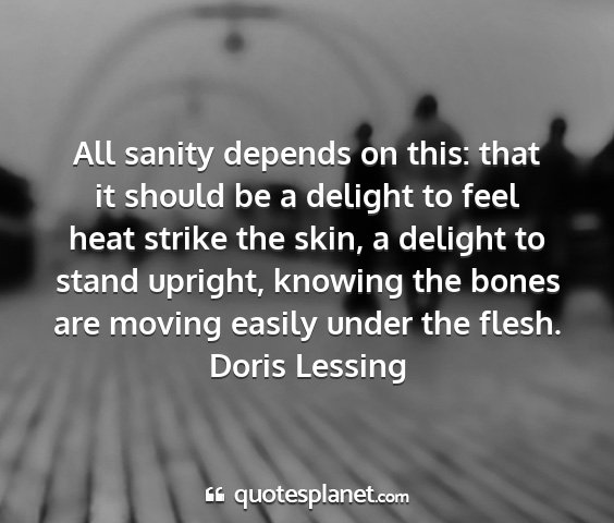 All sanity depends on this: that it should be a delight to feel heat strike the skin, a delight to stand upright, knowing the bones are moving easily under the flesh.Doris Lessing