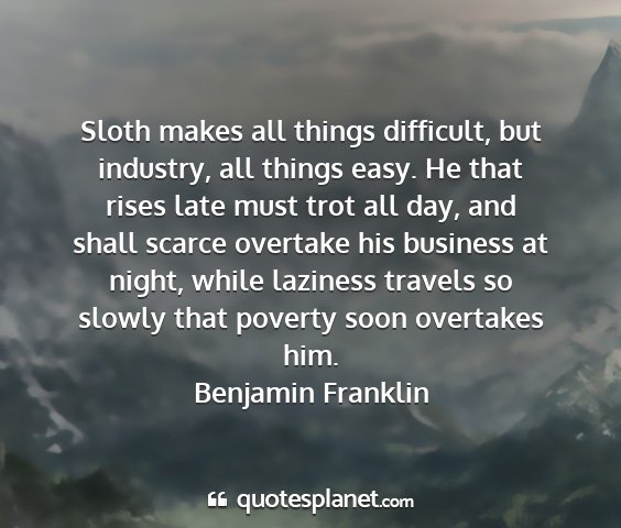 Sloth makes all things difficult, but industry, all things easy. He that rises late must trot all day, and shall scarce overtake his business at night, while laziness travels so slowly that poverty soon overtakes him.Benjamin Franklin