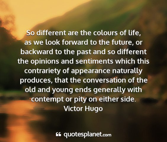 So different are the colours of life, as we look forward to the future, or backward to the past and so different the opinions and sentiments which this contrariety of appearance naturally produces, that the conversation of the old and young ends generally with contempt or pity on either side.Victor Hugo