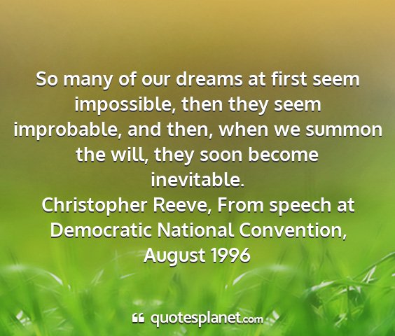 So many of our dreams at first seem impossible, then they seem improbable, and then, when we summon the will, they soon become inevitable.Christopher Reeve, From speech at Democratic National Convention, August 1996