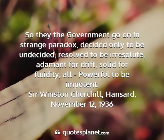 So they the Government go on in strange paradox, decided only to be undecided, resolved to be irresolute, adamant for drift, solid for fluidity, all - Powerful to be impotent.Sir Winston Churchill, Hansard, November 12, 1936