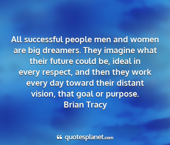 All successful people men and women are big dreamers. They imagine what their future could be, ideal in every respect, and then they work every day toward their distant vision, that goal or purpose.Brian Tracy