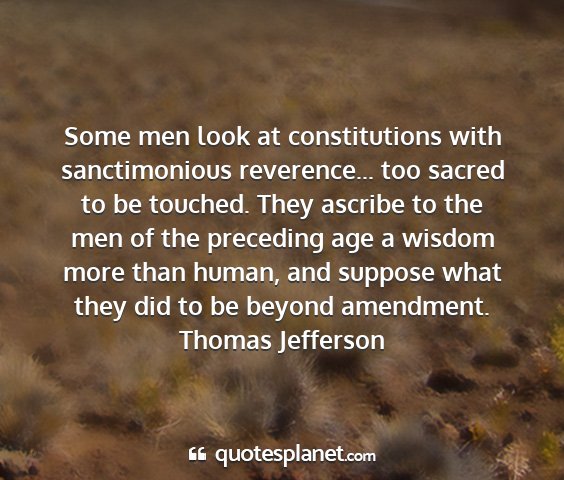Some men look at constitutions with sanctimonious reverence... too sacred to be touched. They ascribe to the men of the preceding age a wisdom more than human, and suppose what they did to be beyond amendment.Thomas Jefferson
