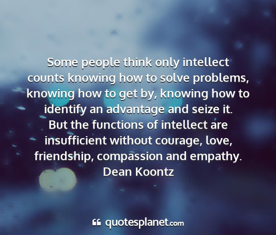 Some people think only intellect counts knowing how to solve problems, knowing how to get by, knowing how to identify an advantage and seize it. But the functions of intellect are insufficient without courage, love, friendship, compassion and empathy.Dean Koontz