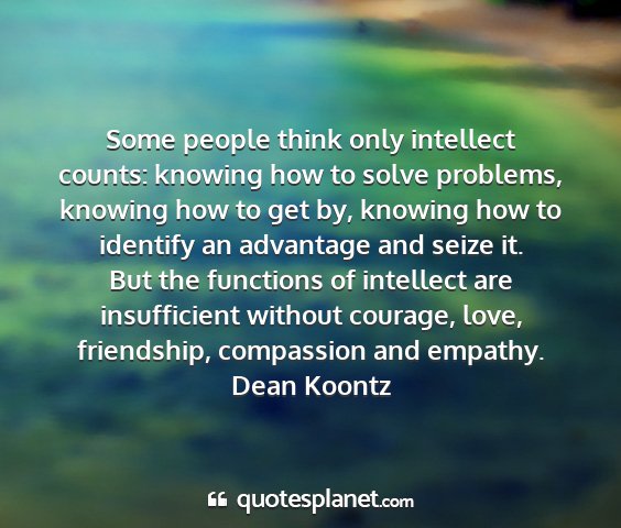 Some people think only intellect counts: knowing how to solve problems, knowing how to get by, knowing how to identify an advantage and seize it. But the functions of intellect are insufficient without courage, love, friendship, compassion and empathy.Dean Koontz
