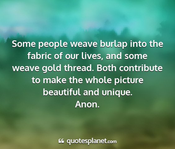 Some people weave burlap into the fabric of our lives, and some weave gold thread. Both contribute to make the whole picture beautiful and unique.Anon.