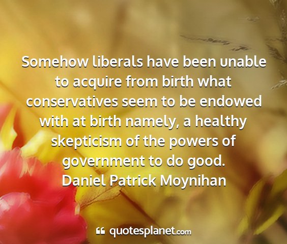 Somehow liberals have been unable to acquire from birth what conservatives seem to be endowed with at birth namely, a healthy skepticism of the powers of government to do good.Daniel Patrick Moynihan