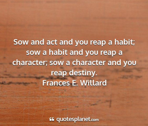 Sow and act and you reap a habit; sow a habit and you reap a character; sow a character and you reap destiny.Frances E. Willard