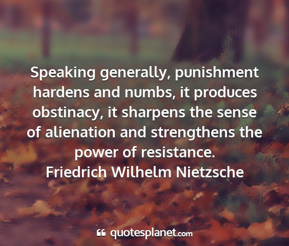 Speaking generally, punishment hardens and numbs, it produces obstinacy, it sharpens the sense of alienation and strengthens the power of resistance.Friedrich Wilhelm Nietzsche