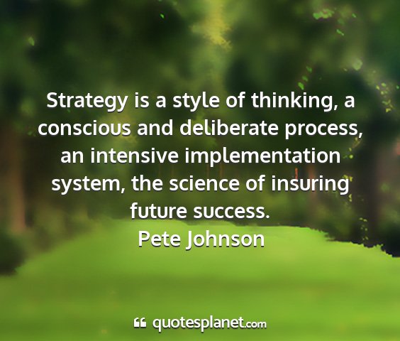 Strategy is a style of thinking, a conscious and deliberate process, an intensive implementation system, the science of insuring future success.Pete Johnson