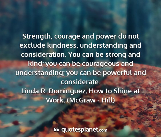 Strength, courage and power do not exclude kindness, understanding and consideration. You can be strong and kind; you can be courageous and understanding; you can be powerful and considerate.Linda R. Dominguez, How to Shine at Work, (McGraw - Hill)