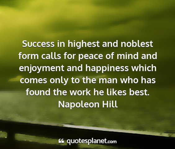 Success in highest and noblest form calls for peace of mind and enjoyment and happiness which comes only to the man who has found the work he likes best.Napoleon Hill
