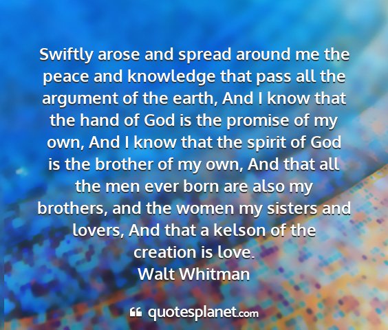 Swiftly arose and spread around me the peace and knowledge that pass all the argument of the earth, And I know that the hand of God is the promise of my own, And I know that the spirit of God is the brother of my own, And that all the men ever born are also my brothers, and the women my sisters and lovers, And that a kelson of the creation is love.Walt Whitman