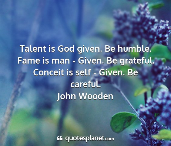 Talent is God given. Be humble. Fame is man - Given. Be grateful. Conceit is self - Given. Be careful.John Wooden