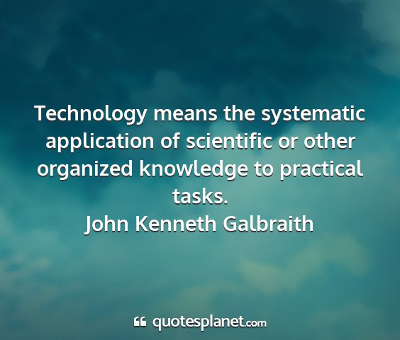 Technology means the systematic application of scientific or other organized knowledge to practical tasks.John Kenneth Galbraith