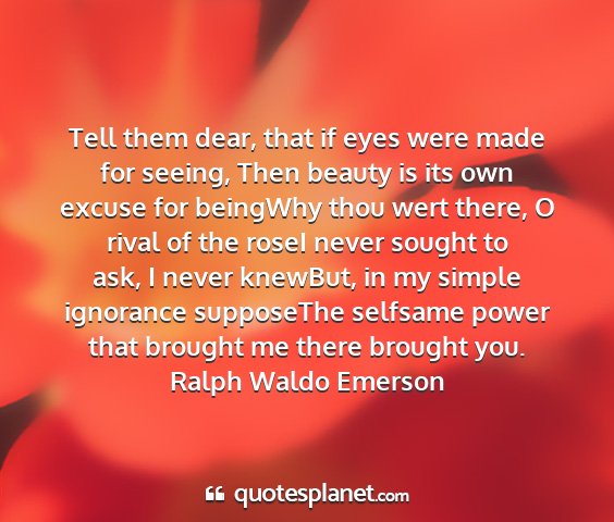 Tell them dear, that if eyes were made for seeing, Then beauty is its own excuse for beingWhy thou wert there, O rival of the roseI never sought to ask, I never knewBut, in my simple ignorance supposeThe selfsame power that brought me there brought you.Ralph Waldo Emerson
