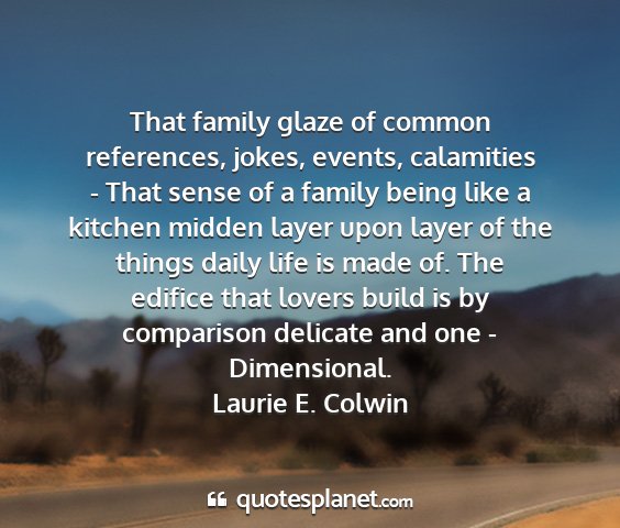 That family glaze of common references, jokes, events, calamities - That sense of a family being like a kitchen midden layer upon layer of the things daily life is made of. The edifice that lovers build is by comparison delicate and one - Dimensional.Laurie E. Colwin
