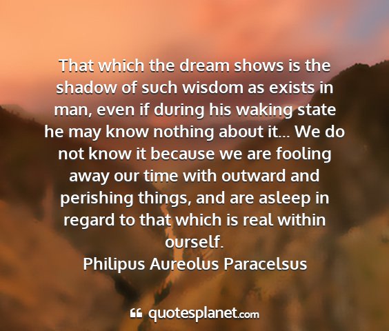 That which the dream shows is the shadow of such wisdom as exists in man, even if during his waking state he may know nothing about it... We do not know it because we are fooling away our time with outward and perishing things, and are asleep in regard to that which is real within ourself.Philipus Aureolus Paracelsus