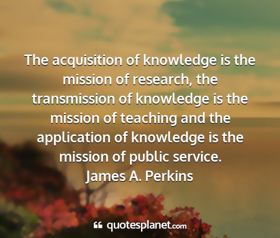The acquisition of knowledge is the mission of research, the transmission of knowledge is the mission of teaching and the application of knowledge is the mission of public service.James A. Perkins