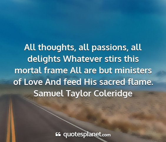 All thoughts, all passions, all delights Whatever stirs this mortal frame All are but ministers of Love And feed His sacred flame.Samuel Taylor Coleridge