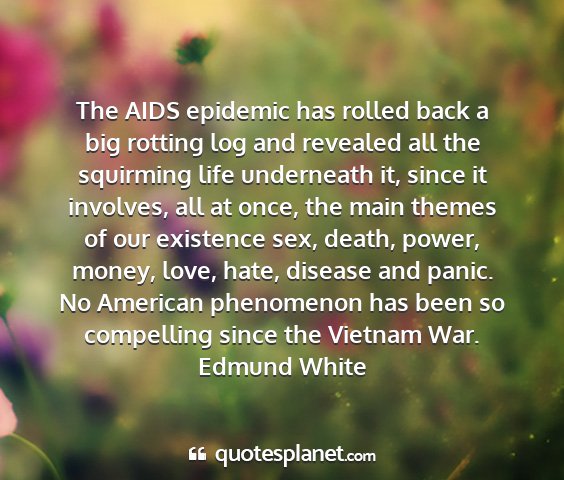 The AIDS epidemic has rolled back a big rotting log and revealed all the squirming life underneath it, since it involves, all at once, the main themes of our existence sex, death, power, money, love, hate, disease and panic. No American phenomenon has been so compelling since the Vietnam War.Edmund White