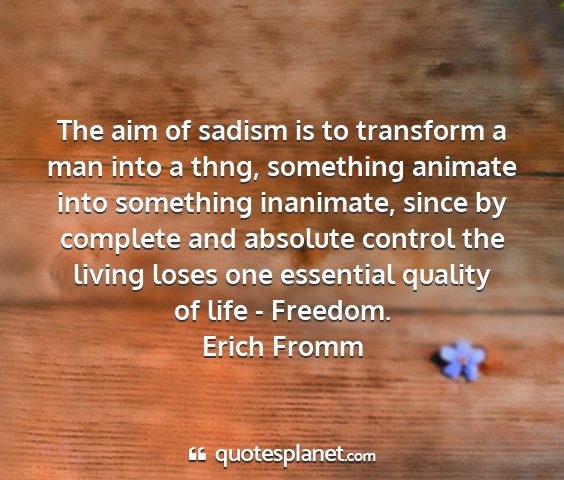The aim of sadism is to transform a man into a thng, something animate into something inanimate, since by complete and absolute control the living loses one essential quality of life - Freedom.Erich Fromm