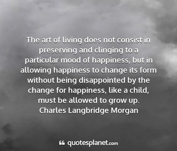 The art of living does not consist in preserving and clinging to a particular mood of happiness, but in allowing happiness to change its form without being disappointed by the change for happiness, like a child, must be allowed to grow up.Charles Langbridge Morgan