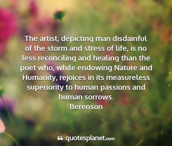 The artist, depicting man disdainful of the storm and stress of life, is no less reconciling and healing than the poet who, while endowing Nature and Humanity, rejoices in its measureless superiority to human passions and human sorrows.Berenson