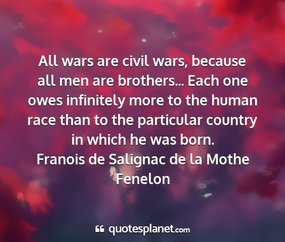 All wars are civil wars, because all men are brothers... Each one owes infinitely more to the human race than to the particular country in which he was born.Franois de Salignac de la Mothe Fenelon