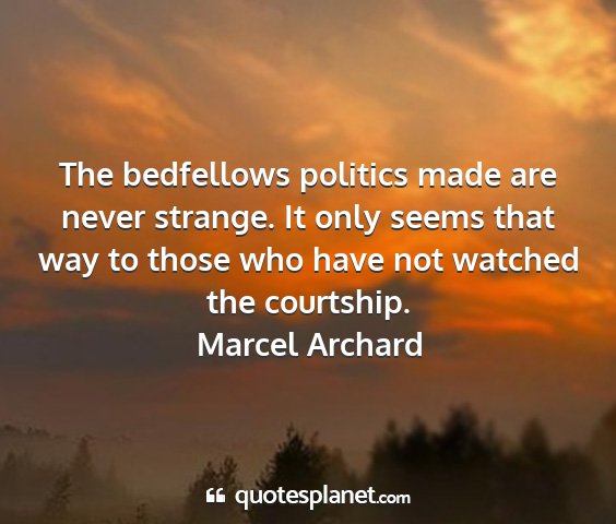 The bedfellows politics made are never strange. It only seems that way to those who have not watched the courtship.Marcel Archard