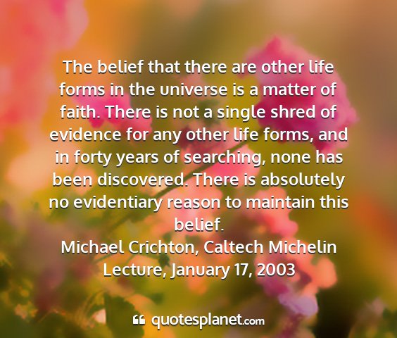 The belief that there are other life forms in the universe is a matter of faith. There is not a single shred of evidence for any other life forms, and in forty years of searching, none has been discovered. There is absolutely no evidentiary reason to maintain this belief.Michael Crichton, Caltech Michelin Lecture, January 17, 2003
