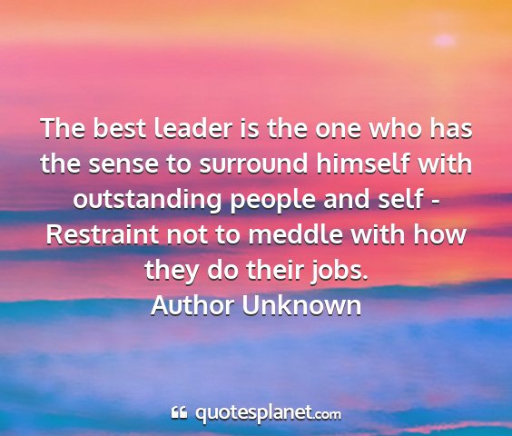 The best leader is the one who has the sense to surround himself with outstanding people and self - Restraint not to meddle with how they do their jobs.Author Unknown