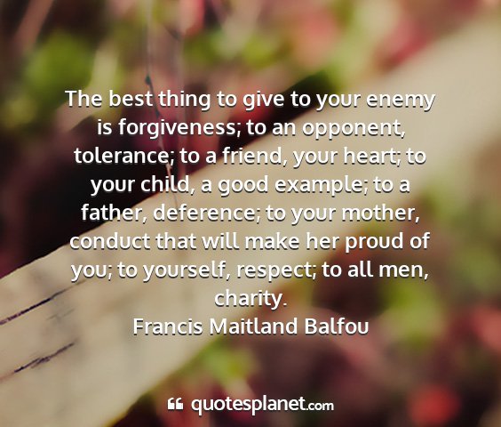 The best thing to give to your enemy is forgiveness; to an opponent, tolerance; to a friend, your heart; to your child, a good example; to a father, deference; to your mother, conduct that will make her proud of you; to yourself, respect; to all men, charity.Francis Maitland Balfou