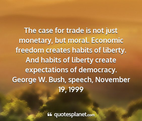 The case for trade is not just monetary, but moral. Economic freedom creates habits of liberty. And habits of liberty create expectations of democracy.George W. Bush, speech, November 19, 1999