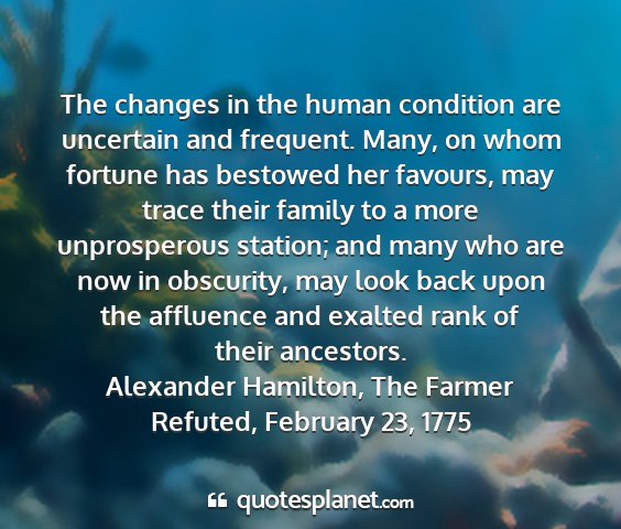 The changes in the human condition are uncertain and frequent. Many, on whom fortune has bestowed her favours, may trace their family to a more unprosperous station; and many who are now in obscurity, may look back upon the affluence and exalted rank of their ancestors.Alexander Hamilton, The Farmer Refuted, February 23, 1775