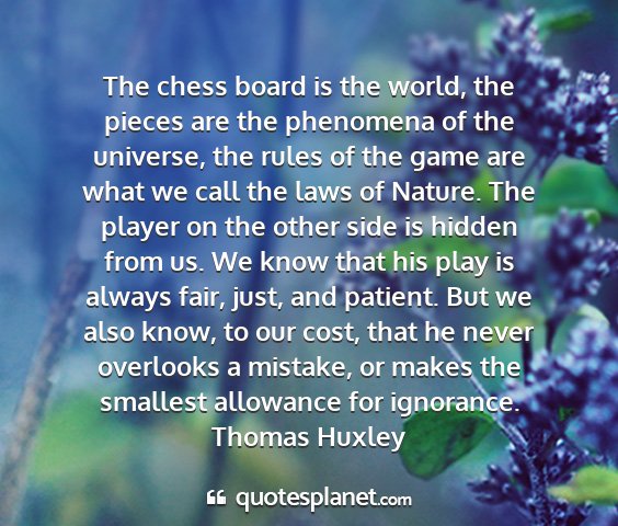The chess board is the world, the pieces are the phenomena of the universe, the rules of the game are what we call the laws of Nature. The player on the other side is hidden from us. We know that his play is always fair, just, and patient. But we also know, to our cost, that he never overlooks a mistake, or makes the smallest allowance for ignorance.Thomas Huxley