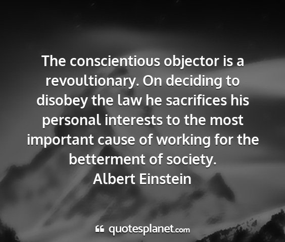 The conscientious objector is a revoultionary. On deciding to disobey the law he sacrifices his personal interests to the most important cause of working for the betterment of society.Albert Einstein
