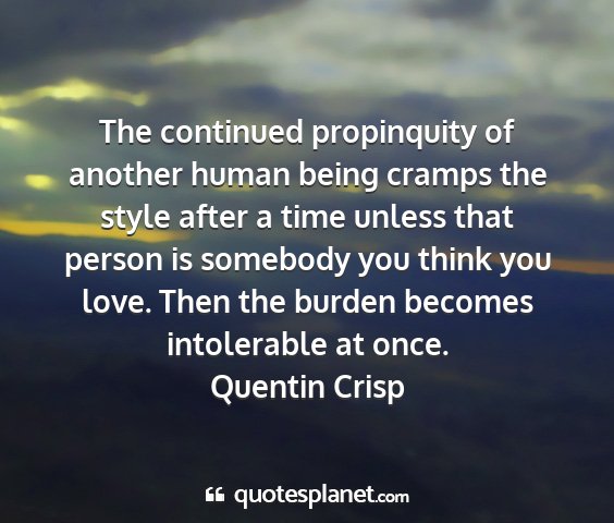 The continued propinquity of another human being cramps the style after a time unless that person is somebody you think you love. Then the burden becomes intolerable at once.Quentin Crisp