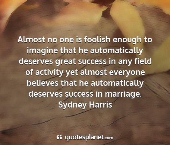 Almost no one is foolish enough to imagine that he automatically deserves great success in any field of activity yet almost everyone believes that he automatically deserves success in marriage.Sydney Harris