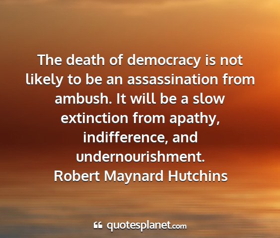 The death of democracy is not likely to be an assassination from ambush. It will be a slow extinction from apathy, indifference, and undernourishment.Robert Maynard Hutchins
