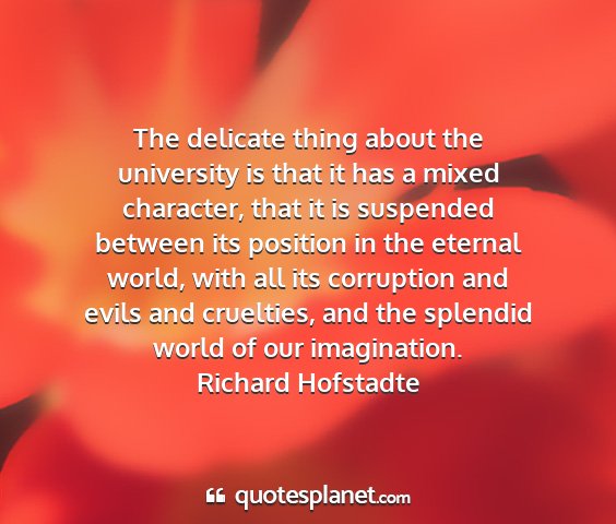 The delicate thing about the university is that it has a mixed character, that it is suspended between its position in the eternal world, with all its corruption and evils and cruelties, and the splendid world of our imagination.Richard Hofstadte