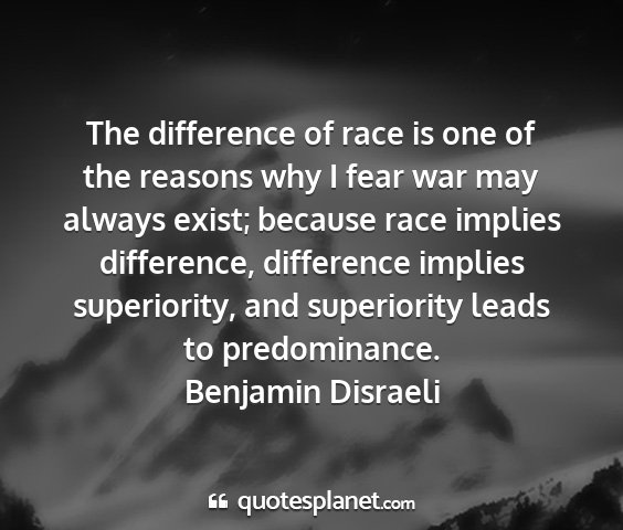 The difference of race is one of the reasons why I fear war may always exist; because race implies difference, difference implies superiority, and superiority leads to predominance.Benjamin Disraeli