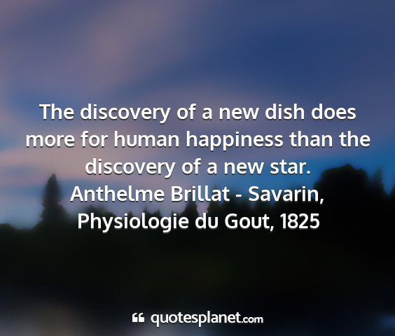 The discovery of a new dish does more for human happiness than the discovery of a new star.Anthelme Brillat - Savarin, Physiologie du Gout, 1825