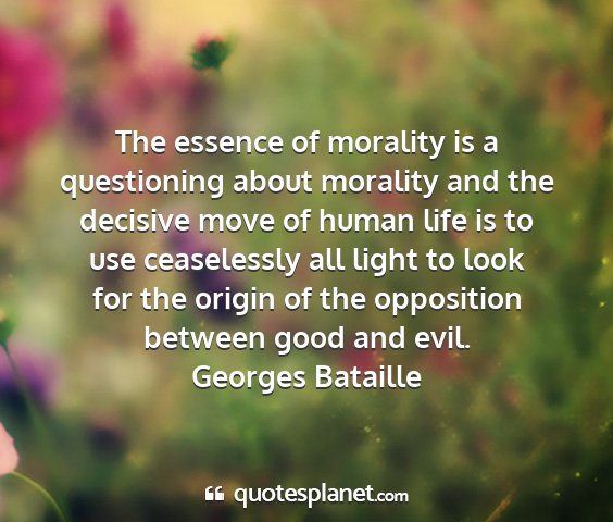 The essence of morality is a questioning about morality and the decisive move of human life is to use ceaselessly all light to look for the origin of the opposition between good and evil.Georges Bataille