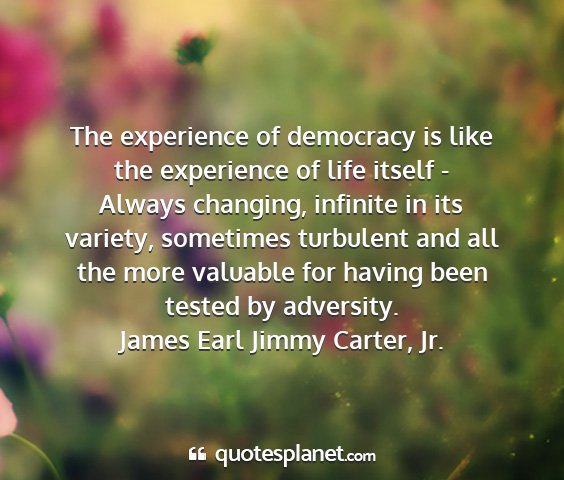 The experience of democracy is like the experience of life itself - Always changing, infinite in its variety, sometimes turbulent and all the more valuable for having been tested by adversity.James Earl Jimmy Carter, Jr.