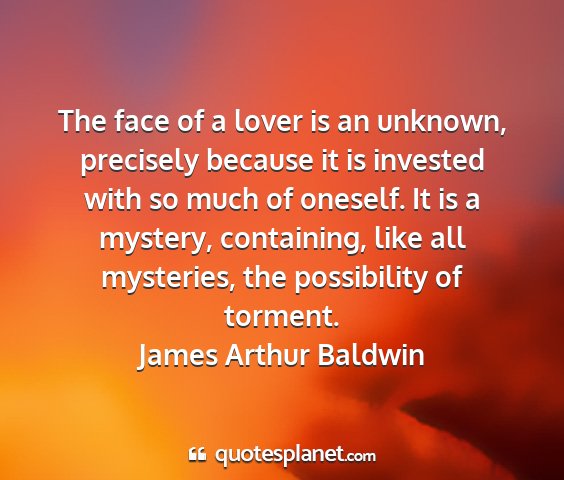 The face of a lover is an unknown, precisely because it is invested with so much of oneself. It is a mystery, containing, like all mysteries, the possibility of torment.James Arthur Baldwin