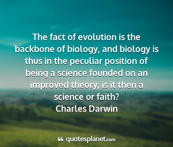 The fact of evolution is the backbone of biology, and biology is thus in the peculiar position of being a science founded on an improved theory, is it then a science or faith?Charles Darwin