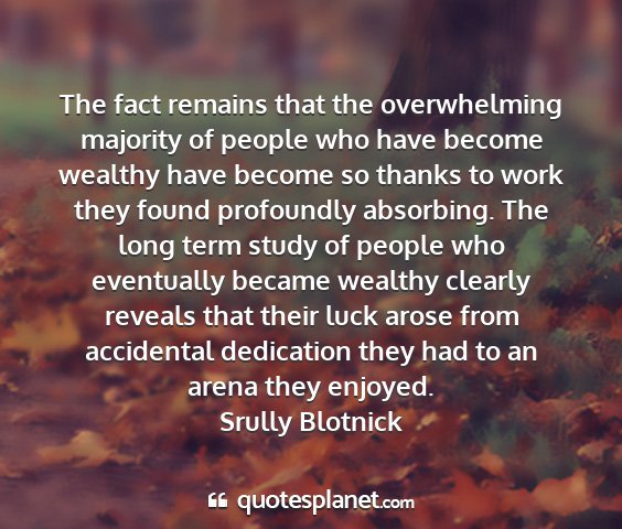The fact remains that the overwhelming majority of people who have become wealthy have become so thanks to work they found profoundly absorbing. The long term study of people who eventually became wealthy clearly reveals that their luck arose from accidental dedication they had to an arena they enjoyed.Srully Blotnick