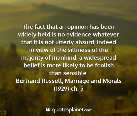 The fact that an opinion has been widely held is no evidence whatever that it is not utterly absurd; indeed in view of the silliness of the majority of mankind, a widespread belief is more likely to be foolish than sensible.Bertrand Russell, Marriage and Morals (1929) ch. 5