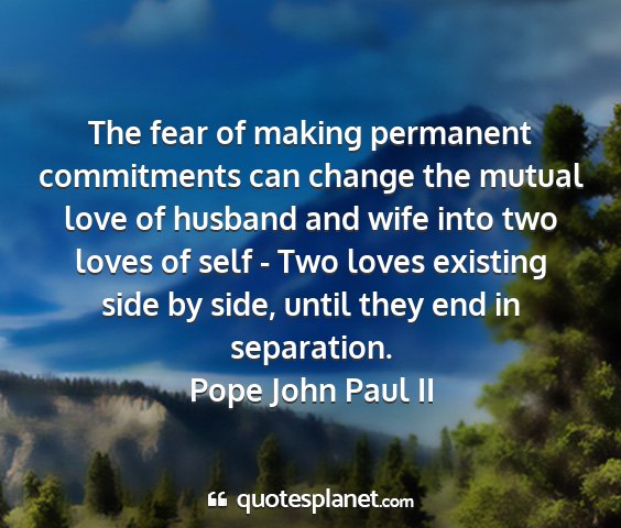 The fear of making permanent commitments can change the mutual love of husband and wife into two loves of self - Two loves existing side by side, until they end in separation.Pope John Paul II